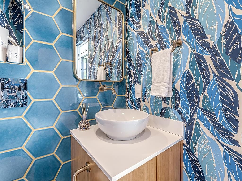 This bathroom showcases a dazzling blend of vibrant colors and textures, featuring a stunning hexagonal turquoise tile accented with golden grout. A modern vessel sink sits atop a sleek, white countertop, harmonizing beautifully with the natural wood cabinetry below. The striking leaf-patterned wallpaper, adorned in shades of blue and green, adds a refreshing touch, reminiscent of a tropical escape. A round mirror framed in gold complements the chic faucet, enhancing the overall elegance. Thoughtfully designed for family use, the space incorporates convenient towel bars and aesthetically pleasing storage, making it both functional and inviting.
