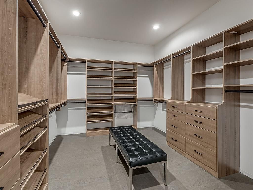 This thoughtfully designed walk-in closet exemplifies functionality and elegance. Crafted with natural wood cabinetry, it offers a blend of open shelving and drawers, perfect for organizing a sophisticated wardrobe. The streamlined layout ensures ample space for easy movement, enhanced by soft, recessed lighting that adds warmth to the minimalist aesthetic. A plush black bench invites relaxation while dressing, providing a stylish contrast to the neutral tones of the surroundings. The durable flooring harmonizes with the cabinetry, creating a cohesive look that balances practicality with comfort, making this closet a family-friendly sanctuary for daily routines.