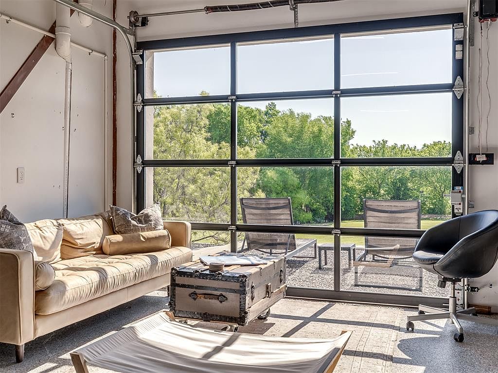Embracing an open-concept design, this living area seamlessly connects indoor comfort with the beauty of nature. A stylish, plush sofa adorned with decorative pillows invites relaxation, while a sleek, black chair adds a modern touch. An industrial-style garage door serves as a functional and aesthetic focal point, creating a wall of glass that allows abundant natural light and picturesque views of the surrounding greenery. Textured flooring enhances warmth, while a rustic coffee table adds character. Ideal for family gatherings, the layout promotes interaction, and the rich color palette of neutrals paired with natural elements fosters a welcoming atmosphere.