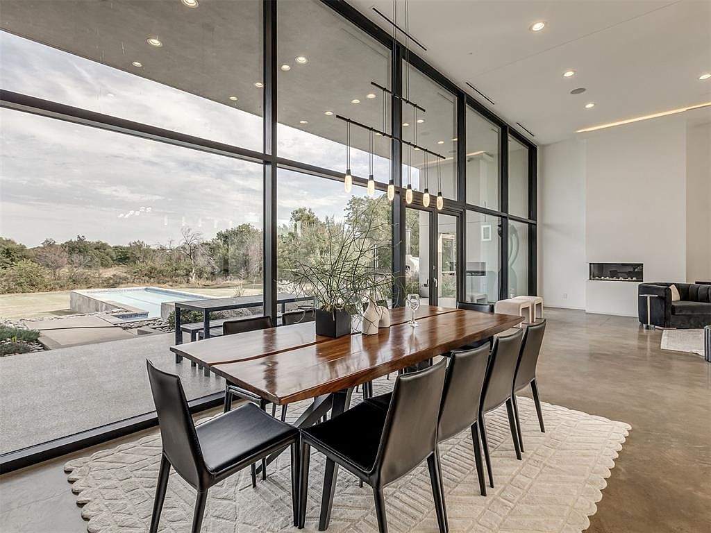 This spacious dining area effortlessly blends modern design with warmth, featuring a long, polished wood table framed by sleek black chairs. Expansive glass walls invite natural light while offering stunning views of the landscaped garden and outdoor pool. A contemporary chandelier hangs gracefully above, illuminating the space tastefully. Soft, neutral tones dominate the color scheme, creating a serene ambiance that complements the home’s architecture. The seamless transition from dining to living area enhances flow, making it perfect for family gatherings. A cozy seating section nearby adds to the inviting atmosphere, ideal for both casual meals and sophisticated entertaining.