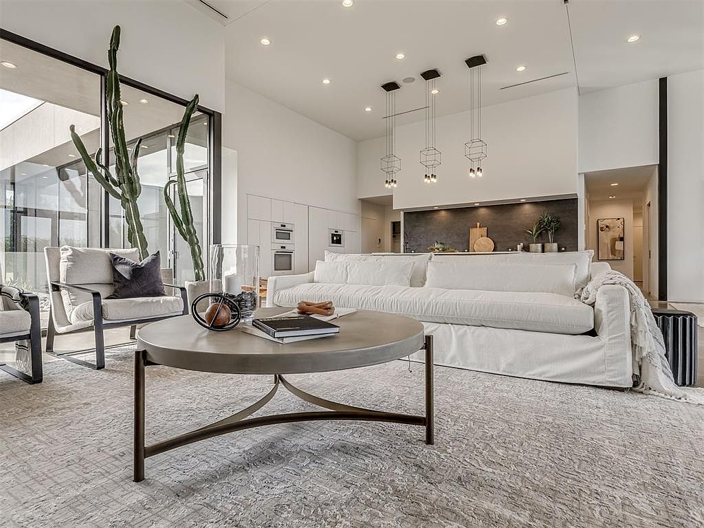 This spacious living room showcases a harmonious blend of contemporary design and comfort. A large, white sectional sofa invites relaxation, complemented by plush accent chairs in dark hues, creating a cozy gathering space. Expansive floor-to-ceiling windows flood the area with natural light while offering stunning views of the outdoors. The sleek coffee table rests on a soft, patterned area rug, adding texture to the room. An integrated entertainment unit houses a modern TV, while the understated color scheme of whites, greys, and dark accents promotes an airy, inviting atmosphere. Ideal for family gatherings or quiet evenings.