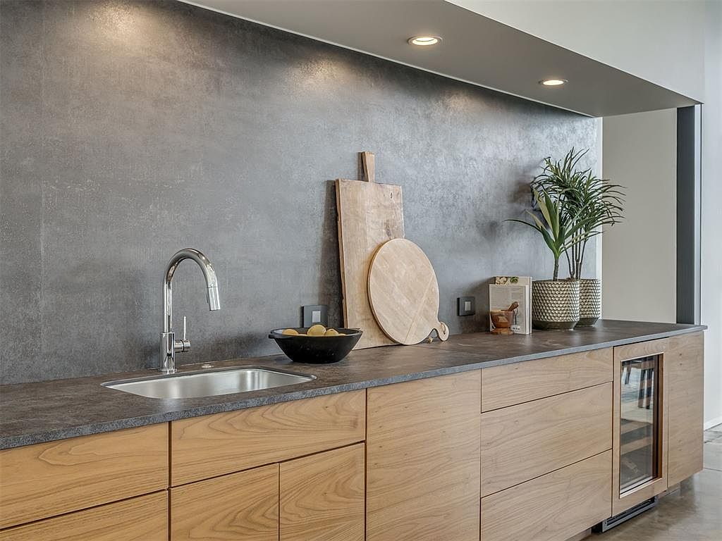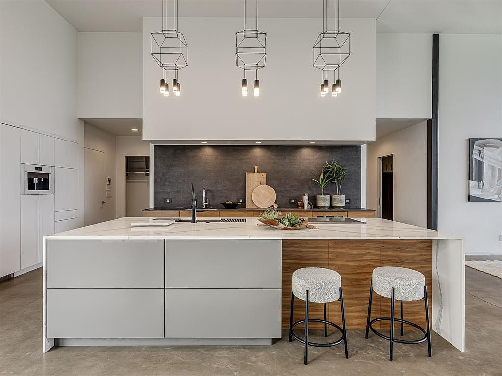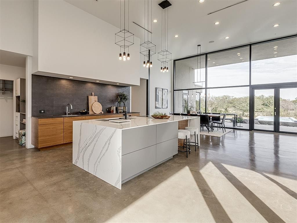 This contemporary kitchen features a spacious open layout that seamlessly blends functionality with aesthetics. The sleek kitchen island, made of elegant white stone with subtle veining, serves as both a cooking area and a casual dining spot with stylish bar stools. Dark wood cabinetry contrasts beautifully against a chic, textured gray backsplash, adding warmth to the modern vibe. Oversized windows fill the space with natural light, enhancing the airy feel and providing a view of the outdoor surroundings. Minimalist pendant lighting and polished concrete floors further accentuate the clean lines, creating a family-friendly environment perfect for both cooking and entertaining.