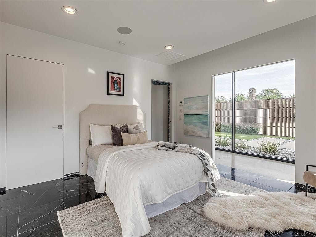 This master bedroom embodies modern elegance and comfort, featuring a spacious layout with sleek black marble flooring that adds sophistication. The room is anchored by a plush upholstered headboard and adorned with an inviting white quilt, accented by decorative pillows in various textures. Large windows invite natural light, offering picturesque views of the landscaped garden, enhancing a serene atmosphere. A stylish area rug and soft throw provide warmth, while contemporary artwork enhances the aesthetic. Thoughtful family-friendly design includes ample natural light and easy access, making this space perfect for relaxation and family time.