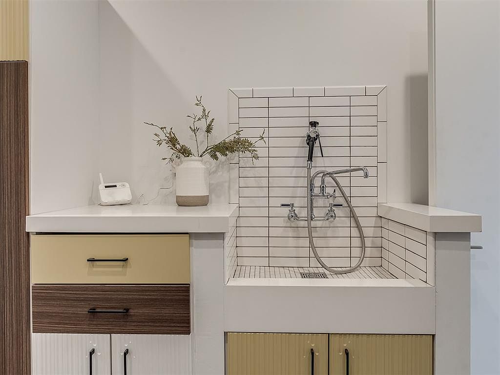 This modern laundry space features sleek cabinetry and a functional design, providing ample storage and practicality. The color scheme blends warm wood tones with crisp white and soft pastel hues, creating a welcoming atmosphere. A stylish countertop enhances the workspace, while the minimalist backsplash adds a touch of elegance. The well-placed sink is ideal for pre-washing, featuring a contemporary faucet for ease of use. Decorative elements, such as a vase with greenery, bring life to the space, making it feel inviting. Family-friendly features ensure this room is both efficient and aesthetically pleasing, perfect for busy lifestyles.
