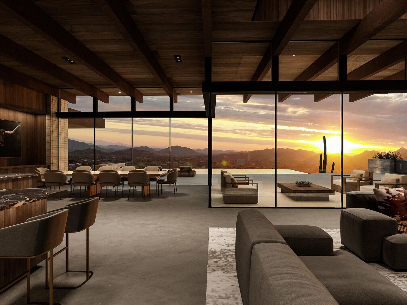 This contemporary living room exudes elegance and warmth, featuring expansive glass walls that invite breathtaking sunset views. The high ceilings with wooden beams and a rich wood accent wall create a harmonious blend of indoor and outdoor spaces. Minimalist furniture includes plush, neutral-toned sofas and modern accent chairs, fostering a cozy yet sophisticated environment. A stylish area rug grounds the seating area, while a sleek coffee table adds functionality. The open layout promotes family interaction, enhanced by a chic bar space, making it ideal for entertaining guests. Soft lighting and earthy colors create a serene atmosphere perfect for relaxation.