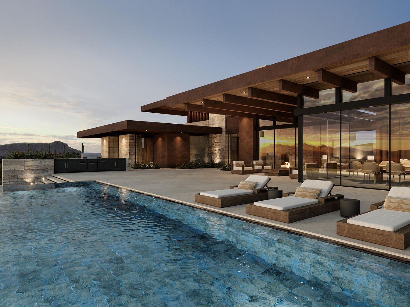 This stunning outdoor living area is the epitome of modern luxury, seamlessly blending indoor and outdoor environments. Featuring a spacious layout, it includes a sparkling pool surrounded by elegant lounge chairs, perfect for family relaxation. The contemporary design showcases warm wood accents and expansive glass windows, inviting natural light and beautiful views of the surrounding landscape. The color palette is a harmonious mix of earthy browns and soft whites, complementing the serene water. Guests can enjoy alfresco dining under the covered patio, creating an inviting atmosphere for gatherings. A true oasis that enhances outdoor living.