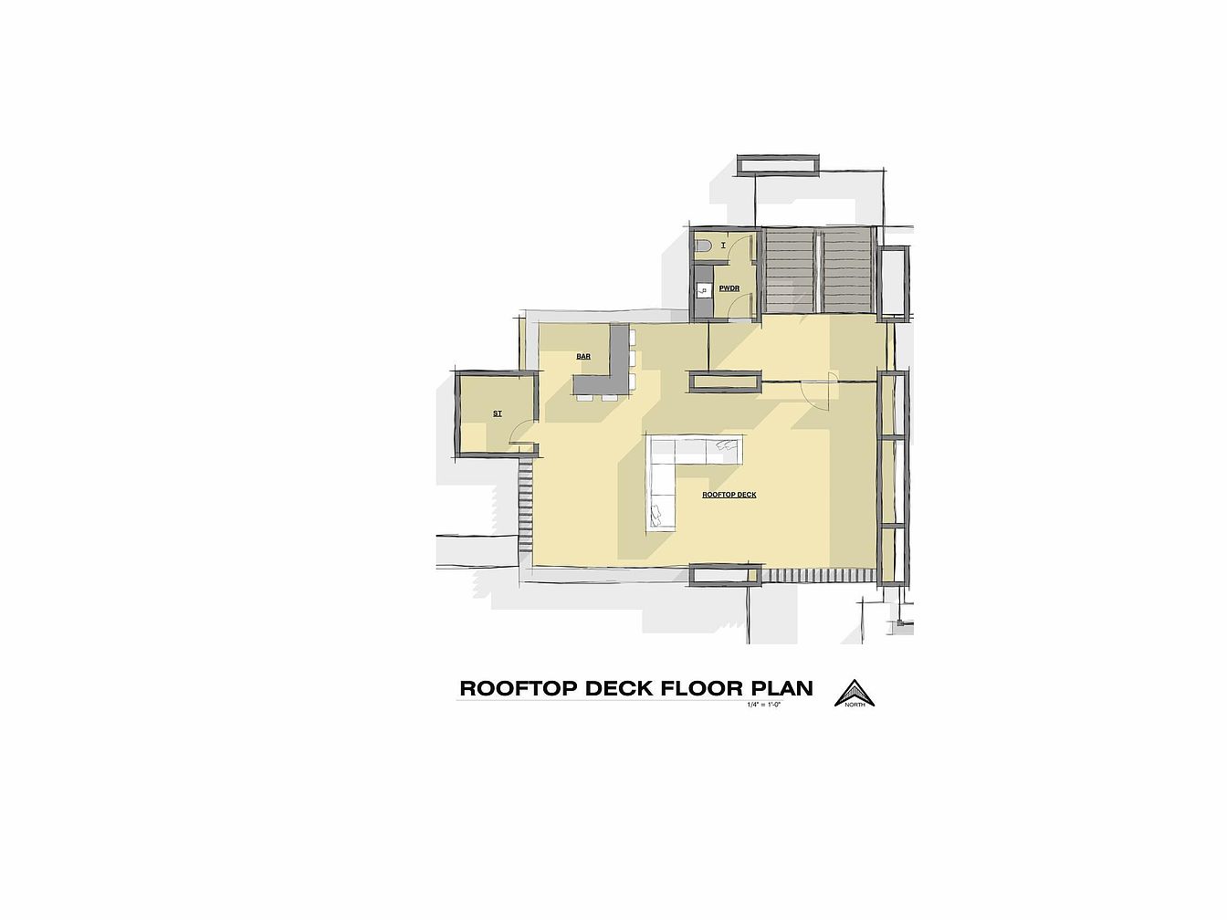 This rooftop deck plan showcases an impressive layout for modern outdoor living. A dedicated bar area enhances social gatherings, while the spacious configuration allows for flexible furniture arrangements, ideal for family-friendly activities. The design features ample open space leading to a cozy rooftop deck, perfect for sunbathing or family barbecues. Light-colored materials promote a bright, airy feel, effortlessly blending relaxation with entertainment. The strategic layout maximizes views and encourages seamless movement between indoor and outdoor areas. Planting options can enhance privacy while integrating greenery into this stylish, functional outdoor oasis, making it an entertainer’s dream.