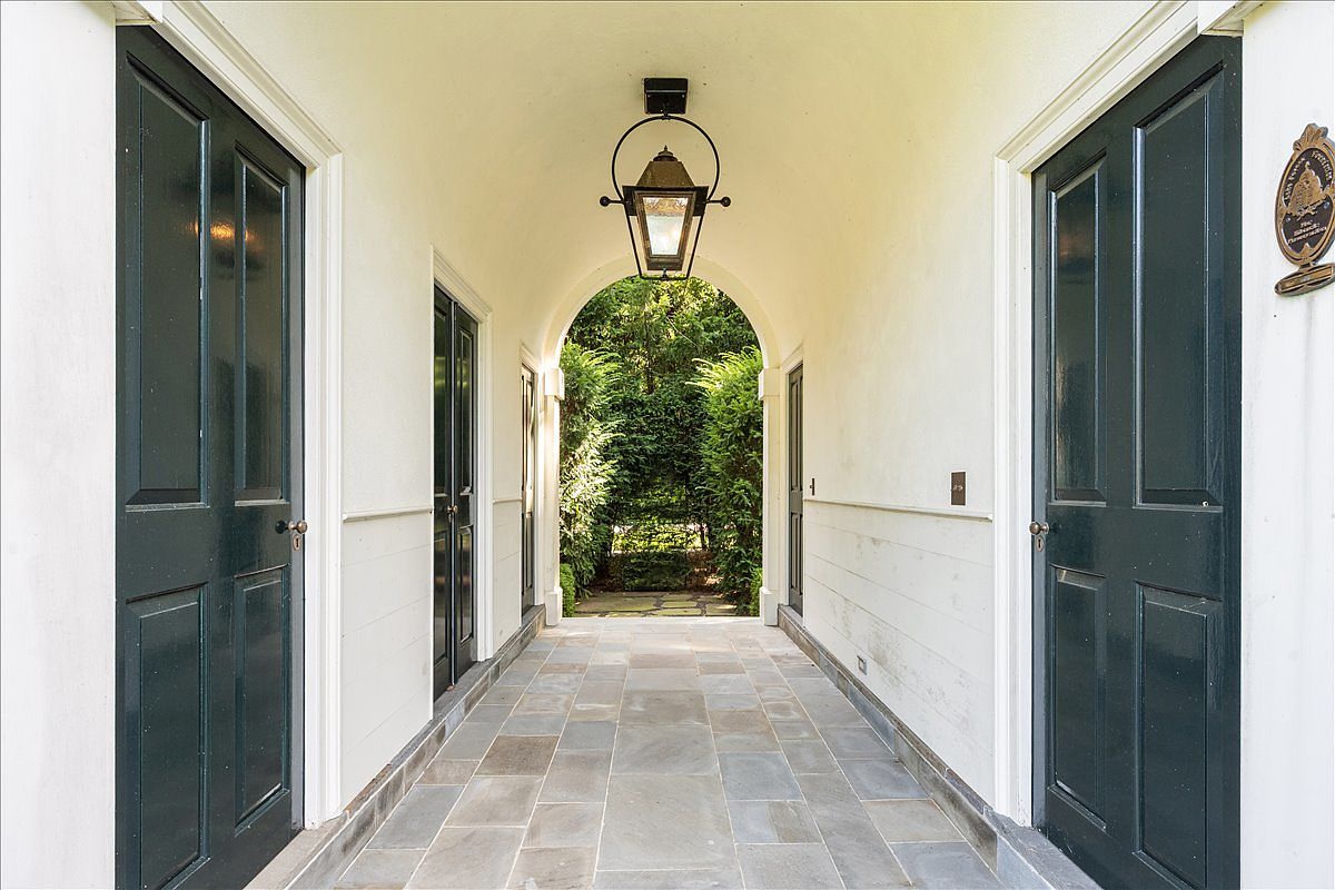 This charming entryway features a graceful arched ceiling complemented by a stylish lantern that provides warm illumination. The slate flooring adds an earthy touch, while the crisp white walls enhance the spacious feel. Flanking the corridor, striking dark green doors create a beautiful contrast and direct visitors toward the lush outdoor greenery beyond. The careful design invites natural light and facilitates easy movement, making it perfect for family gatherings. Subtle architectural details, like the wainscoting and polished hardware, elevate the overall aesthetic, providing an inviting first impression that speaks to the warmth of home.