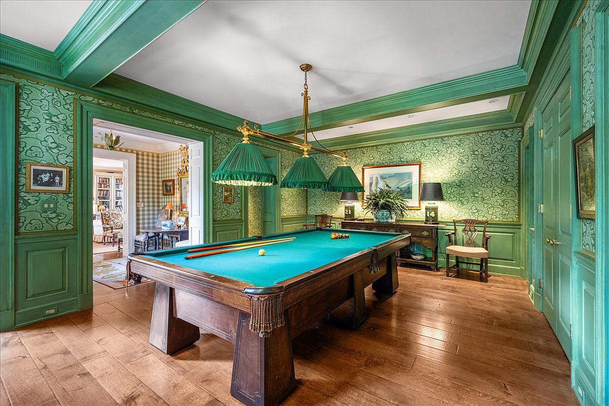 This inviting game room features a vintage pool table set against vibrant green patterned wallpaper, creating a lively atmosphere perfect for family gatherings or entertaining friends. The decor is accentuated by intricately designed molding and rich wooden flooring, fostering warmth and elegance. Suspended above the pool table are stylish green lamps, complementing the overall color scheme. A cozy seating area with antique-style chairs invites relaxation, while framed artwork adds a personal touch. The open layout connects seamlessly to adjoining rooms, emphasizing accessibility and a welcoming flow throughout the home.