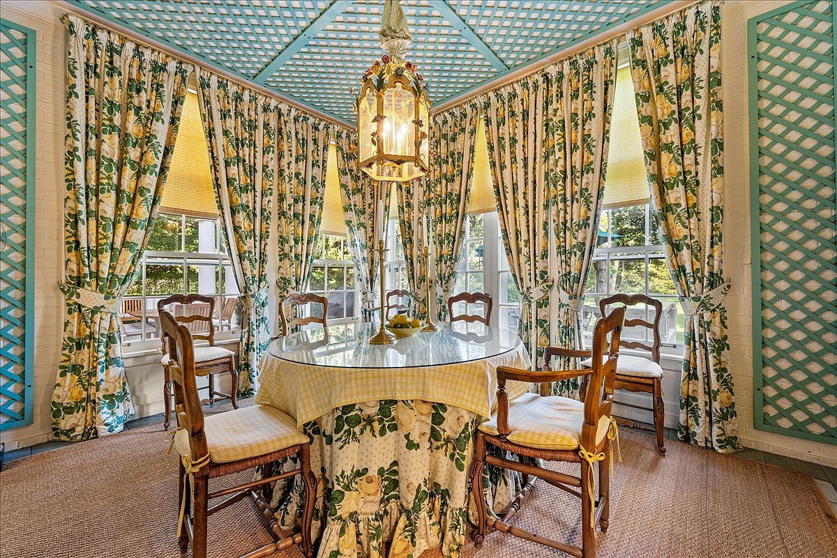 This charming dining room radiates warmth with its inviting layout. A round glass table, accented by a floral-patterned tablecloth, offers ample space for family gatherings. Surrounding the table are elegantly crafted wooden chairs, showcasing a combination of comfort with soft, yellow-checked seat cushions. Vibrant floral drapes frame the windows, allowing natural light to flood the space, while coordinating shades provide privacy. The turquoise lattice ceiling adds a playful touch, complementing the cheerful decor. A striking vintage light fixture hangs overhead, casting a soft glow, creating an idyllic atmosphere perfect for memorable shared meals and family celebrations.
