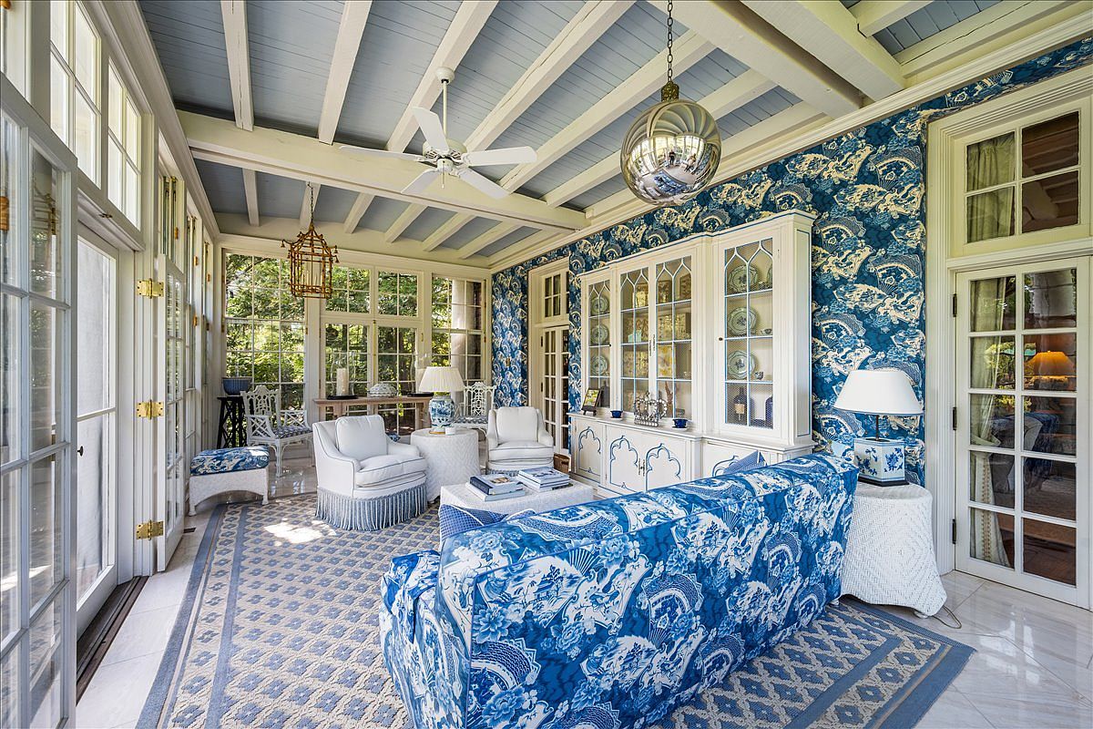 This sunroom boasts a bright and airy layout, designed for relaxation and family gatherings. Sky-blue beams create a striking contrast against the vibrant blue wallpaper adorned with intricate motifs. The plush, patterned couch invites casual seating, complemented by cozy armchairs that enhance the welcoming atmosphere. A stylish coffee table anchors the space, showcasing books and decor. Ample natural light floods through large windows, illuminated by a contemporary pendant light. The room balances elegance with comfort, featuring a combination of soft textiles and classic cabinetry, while the wicker accents add a touch of rustic charm.