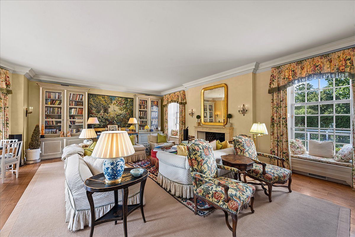 This charming living room blends elegance with comfort, showcasing an inviting layout perfect for family gatherings. The soft, neutral color scheme is accented by vibrant floral patterns on upholstered furnishings, creating a warm and cozy atmosphere. Built-in bookshelves line one wall, filled with books and decorative items, enhancing the room’s character. Large windows draped with rich fabrics allow natural light to illuminate the space, complemented by tasteful lamps that add warmth during the evenings. A classic fireplace serves as a focal point, inviting relaxation, while a cozy reading nook by the window provides a tranquil retreat.