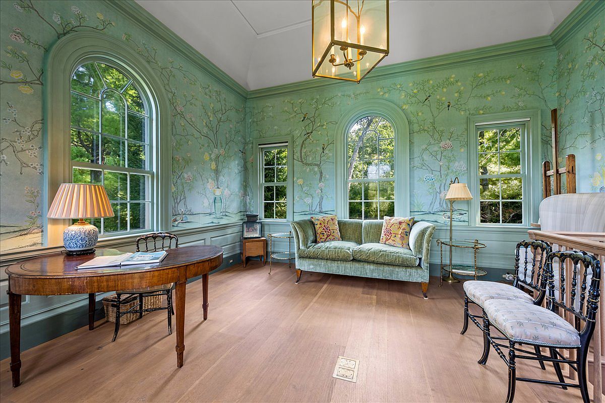 This sunroom exudes charm with its soft, inviting color palette of pale greens and muted floral patterns that embellish the walls. Large arched windows fill the space with natural light, creating a warm and airy ambiance. A plush, olive-green sofa adorned with bright, patterned pillows offers a cozy spot for relaxation. Complemented by a round wooden table, the room encourages gatherings and intimate conversations. Elegant light fixtures enhance the airy feel while adding a touch of classic sophistication. Family-friendly features include spacious seating and an inviting atmosphere, making it a perfect retreat for both adults and children.