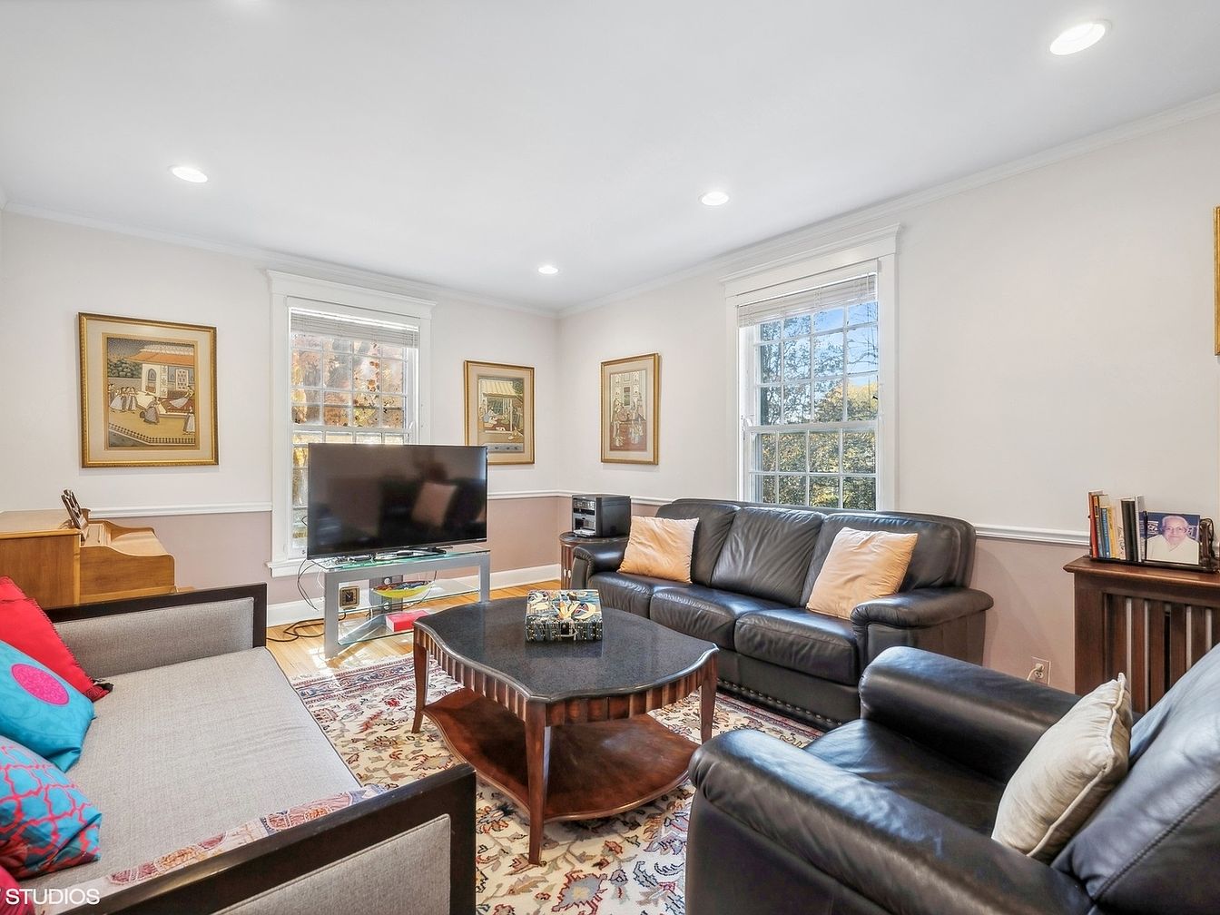 This inviting living room exudes warmth, featuring a comfortable layout ideal for family gatherings. Rich leather sofas frame a stylish coffee table, accented by plush cushions and a vibrant throw. The soft, neutral color palette of the walls creates a serene backdrop, beautifully complemented by framed artwork that adds character. Natural light streams through large windows, enhancing the open feel of the space. The hardwood floors contribute a classic touch, while a cozy area rug anchors the seating arrangement, ensuring a welcoming atmosphere. Thoughtful details like the piano and bookshelves reflect a balance of style and functionality.