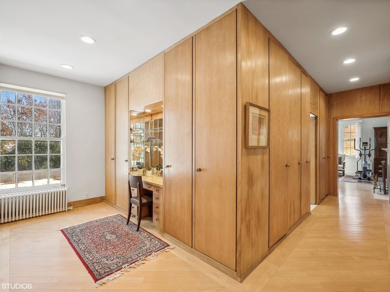 A beautifully designed dressing room exudes warmth and elegance, featuring smooth wooden paneling and ample natural light. The spacious layout includes built-in wardrobes that provide generous storage, seamlessly integrating functionality with style. A cozy area for grooming is highlighted by a discreet vanity table, reflecting a subtle, sophisticated design. The soft color palette enhances the inviting atmosphere, while the polished hardwood floor adds a touch of luxury. A patterned area rug underlines the space, introducing texture and comfort. This room embodies family-friendly features with its practical yet stylish setup, perfect for daily routines.
