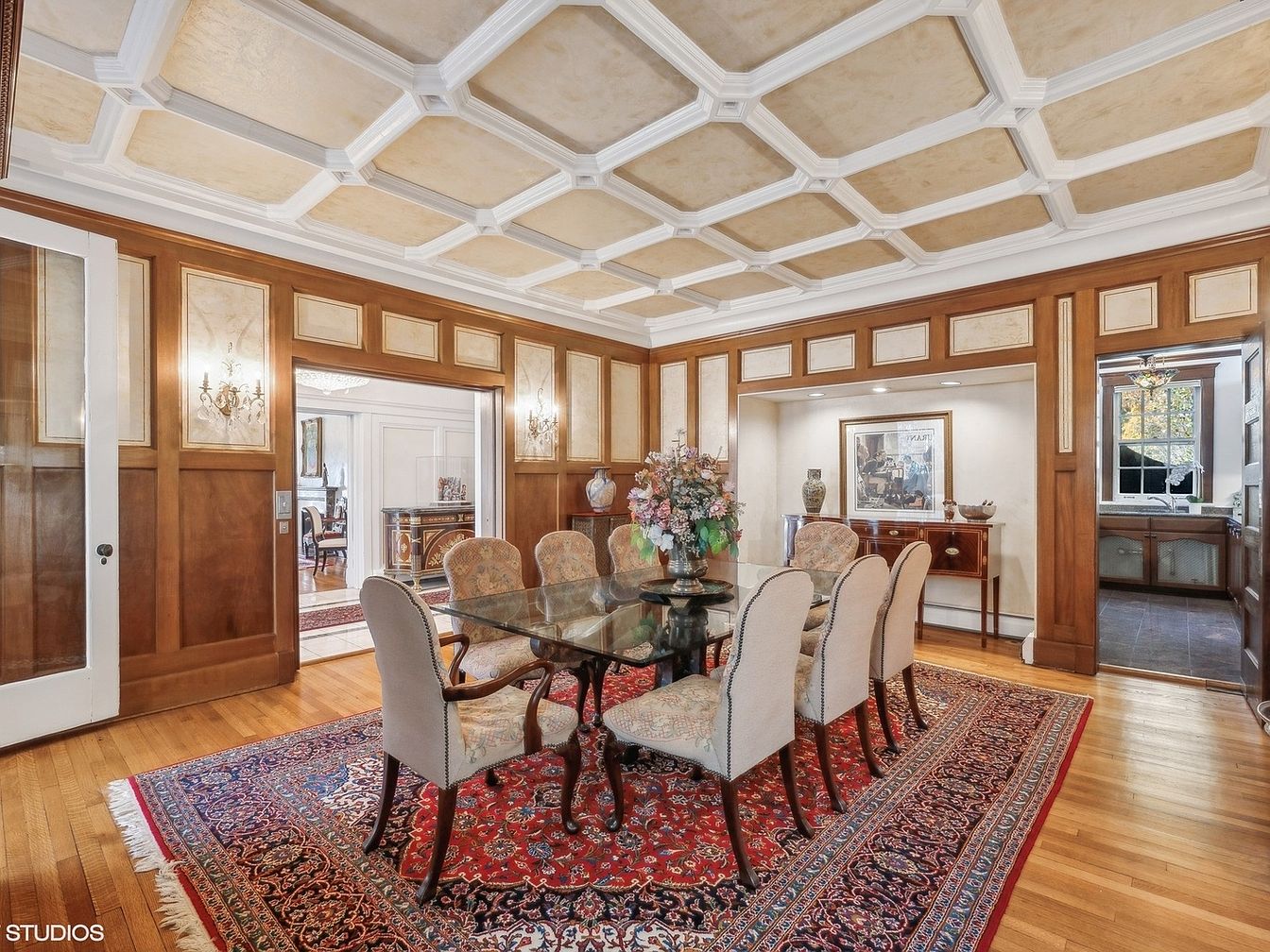 This sophisticated dining room features a rich blend of classic design and modern comforts. A stunning coffered ceiling enhances the space, adorned in soft shades that contrast beautifully with the dark wooden paneling. The rectangular glass dining table is surrounded by upholstered chairs, creating a welcoming atmosphere for family gatherings. A vibrant area rug adds warmth and color, while decorative sconces illuminate the walls, adding a touch of elegance. Open passages lead to adjacent rooms, promoting fluidity in layout, while the fine art pieces and floral arrangements contribute to the room’s sophisticated, yet inviting vibe.