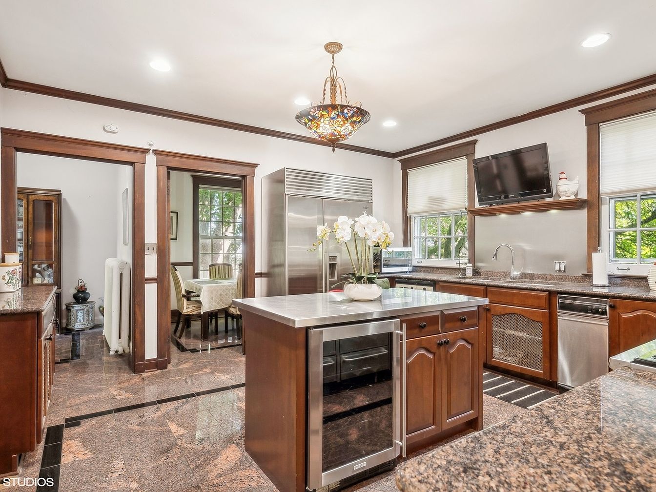 A beautifully designed kitchen featuring rich wooden cabinetry and sleek granite countertops, this space emphasizes functionality and style. The open layout seamlessly connects to an inviting dining area, perfect for family gatherings. A striking stained-glass chandelier adds a touch of elegance, while under-cabinet lighting highlights the modern appliances and countertop workspace. The earthy color scheme of browns and grays creates a warm atmosphere, complemented by the glossy tile flooring which reflects natural light from the nearby windows. Ample storage options ensure organization, making this kitchen both aesthetic and practical, ideal for daily family life and entertaining.