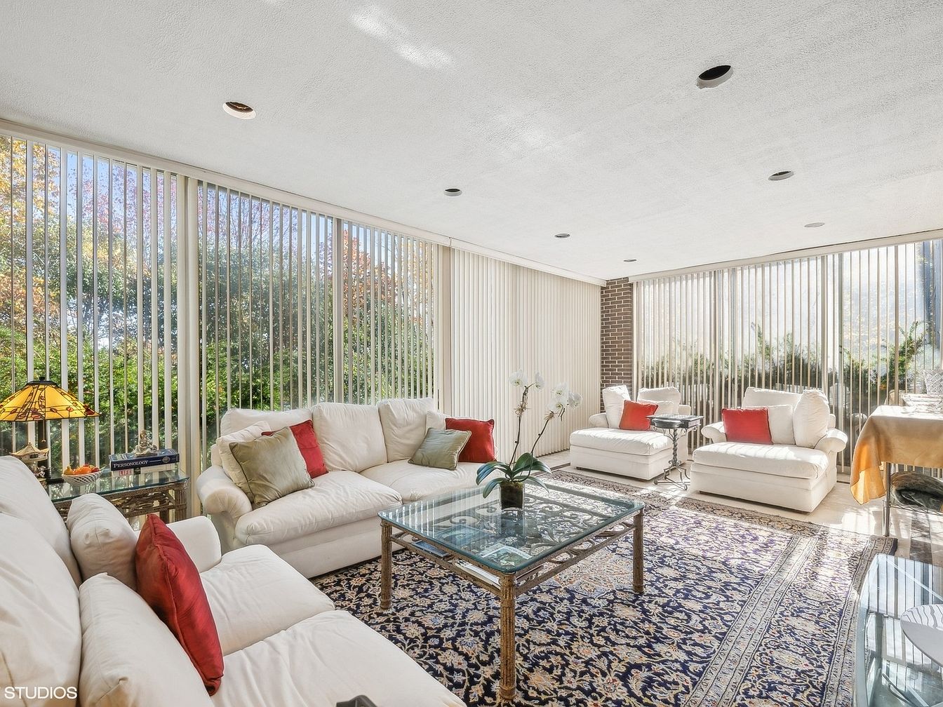 Bathed in natural light, this elegant sunroom features expansive windows adorned with vertical blinds, inviting the outdoors inside. A beautiful area rug anchors the space, providing a splash of color against the light tile flooring. Plush white sofas with decorative red and green cushions offer comfortable seating, perfect for family gatherings or quiet moments. Glass-topped tables reflect sophistication while the nearby greenery adds a touch of nature. Thoughtful architectural details, like the warm brick accents, enhance the inviting atmosphere, making this sunroom a perfect blend of style and comfort for family-friendly leisure.