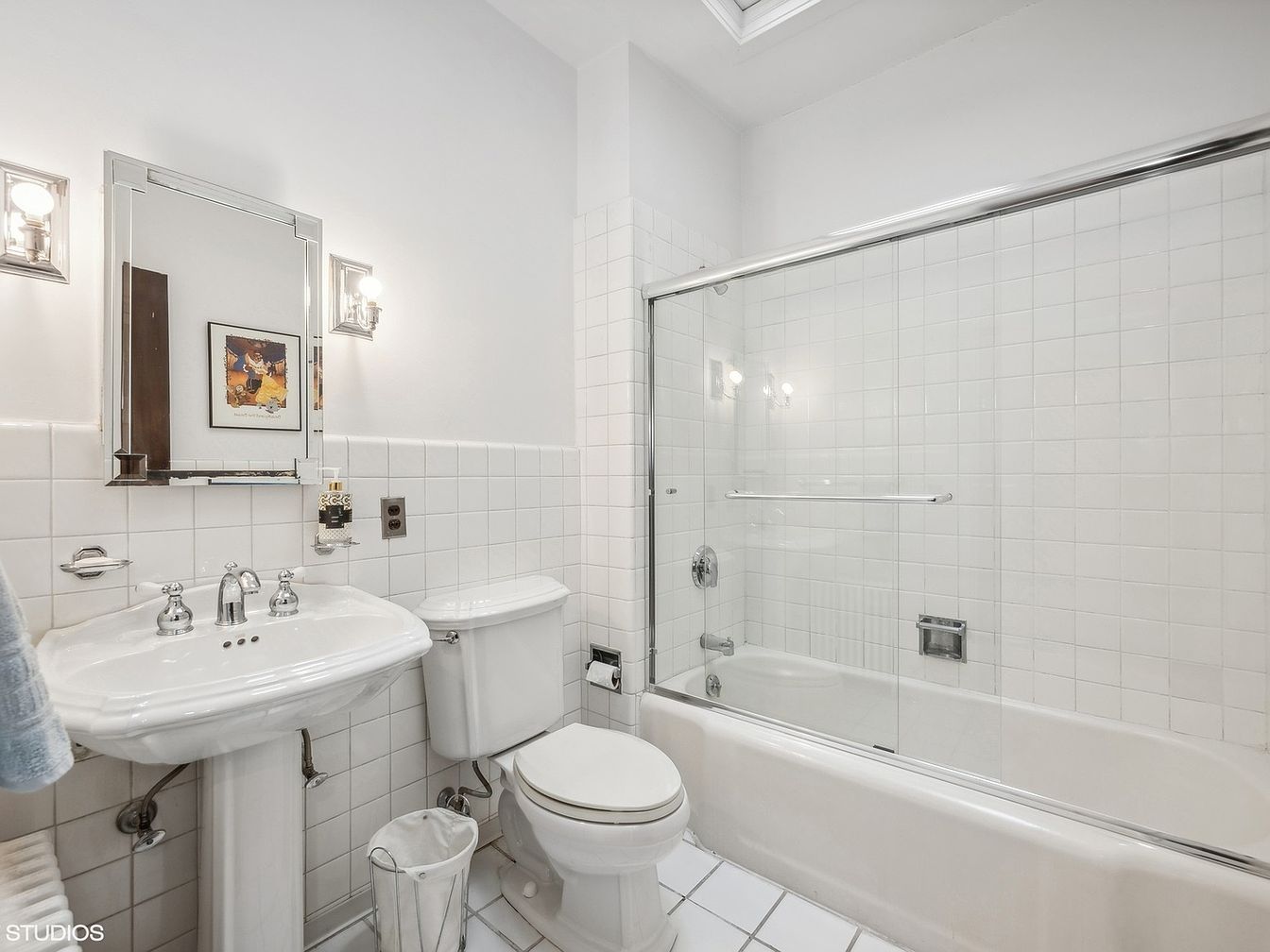 This contemporary bathroom showcases a blend of functionality and style, with white tiled walls creating a fresh and clean aesthetic. A sleek glass shower door complements the elegant bathtub, allowing for spaciousness while maximizing light. The polished sink area features classic chrome fixtures and a large mirror, reflecting warmth from the ambient lighting provided by stylish sconces. Family-friendly features include easy-to-clean surfaces and thoughtful storage solutions. The neutral color scheme harmonizes seamlessly, offering a serene retreat. Artful decor, including framed artwork, adds personality, making this a welcoming and sophisticated space for relaxation.