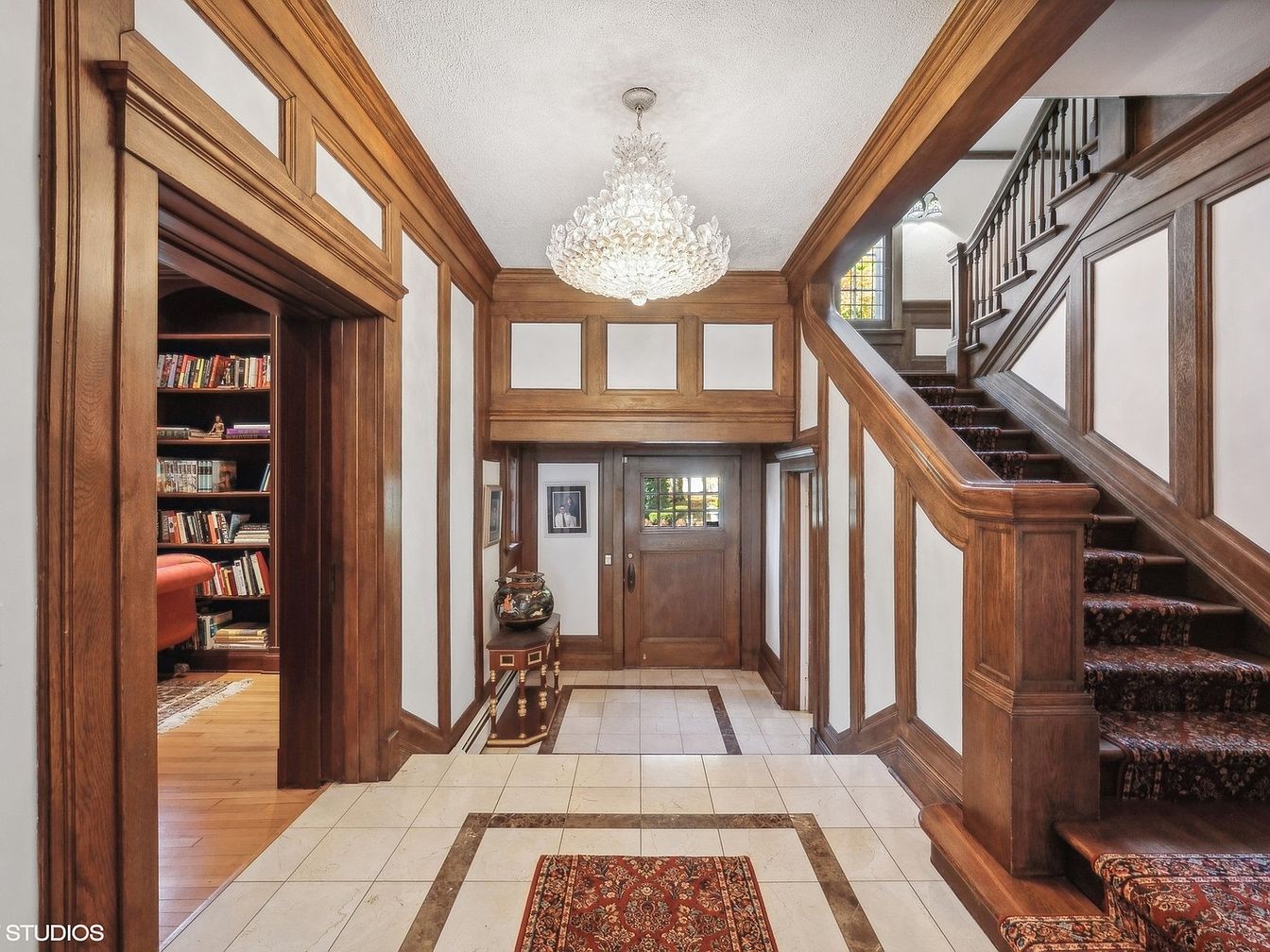 A stunning entryway showcases classic architectural elements with rich wood paneling and elegant trim. The layout features a spacious design, with an inviting staircase leading to the upper levels, perfectly capturing traditional craftsmanship. A sparkling chandelier hangs from the ceiling, illuminating the warm tones of the wood and creating a welcoming ambiance. The entryway’s tiled floor, adorned with intricate patterns, provides a stylish contrast to the plush, patterned runner on the staircase. Bookshelves tucked into the corner offer a cozy reading nook, perfect for family gatherings, while a decorative table near the entrance adds a personalized touch.