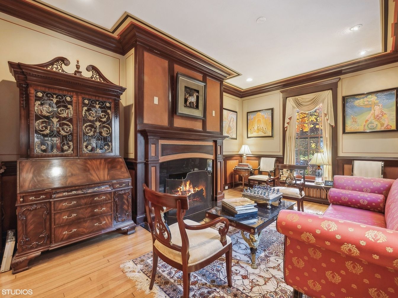 This inviting living room features rich, warm wood paneling that enhances its classic elegance. The focal point is a beautifully crafted fireplace, perfect for family gatherings, complemented by plush seating options including a vibrant pink sofa adorned with subtle floral patterns. A vintage cabinetry piece showcases fine decor, while artwork graces the walls, adding character and color. The layout promotes conversation, with a chess table encouraging family bonding over games. Soft lighting from table lamps creates a cozy ambiance, while large windows invite natural light, making this space both eclectic and welcoming for all ages.