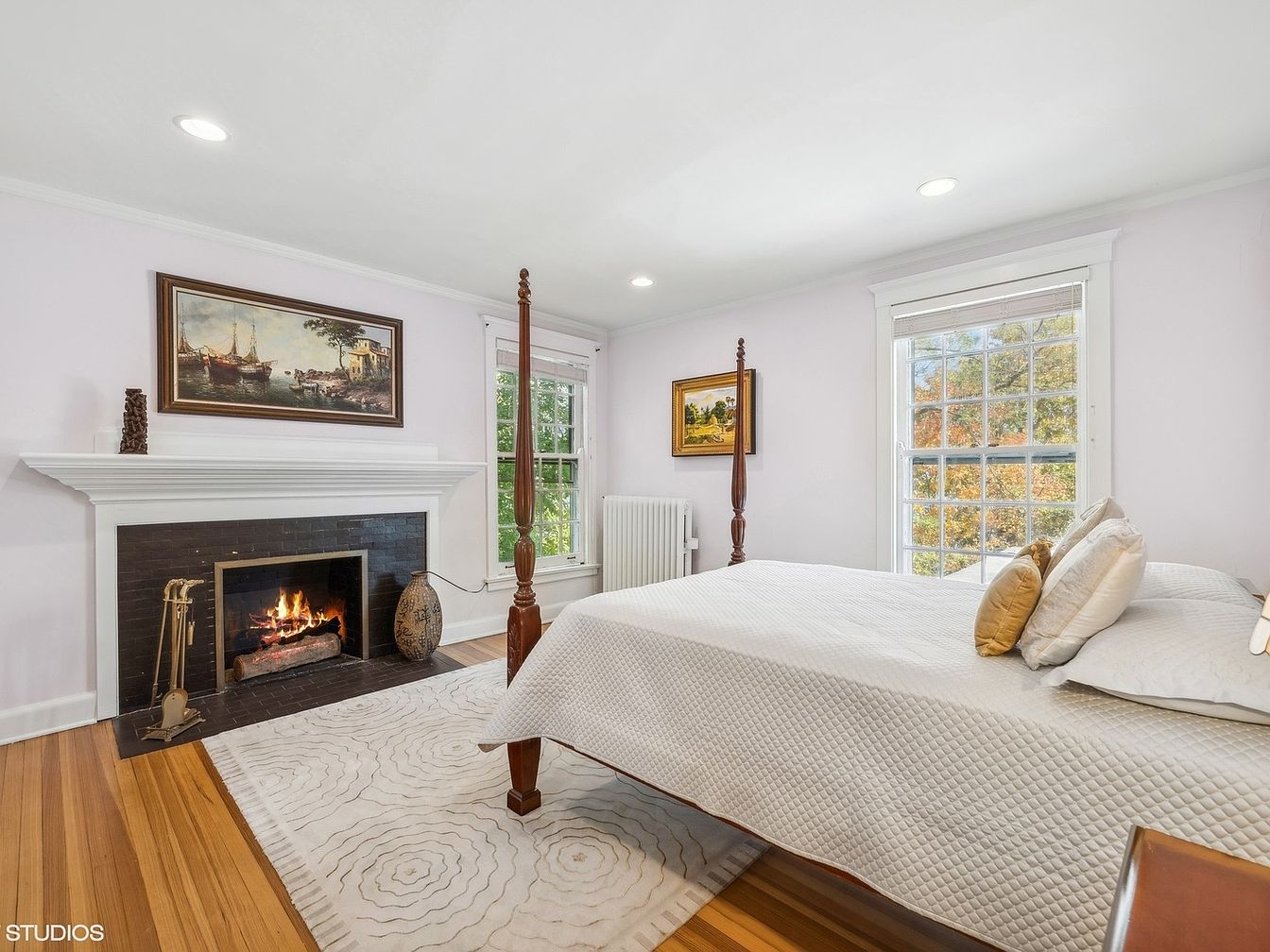 An inviting master bedroom features a serene layout, highlighted by a classic four-poster bed that exudes elegance. The soft lavender walls create a calming atmosphere, perfectly complemented by warm hardwood floors that add a touch of coziness. Natural light floods in through large windows, enhancing the airy feel of the space. A stylish fireplace with a sleek black surround serves as a focal point, ideal for chilly evenings. Family-friendly elements include plush bedding and a spacious area rug that invites relaxation. Decorative artwork adds character, while the blend of modern and traditional design elements ensures timeless appeal.