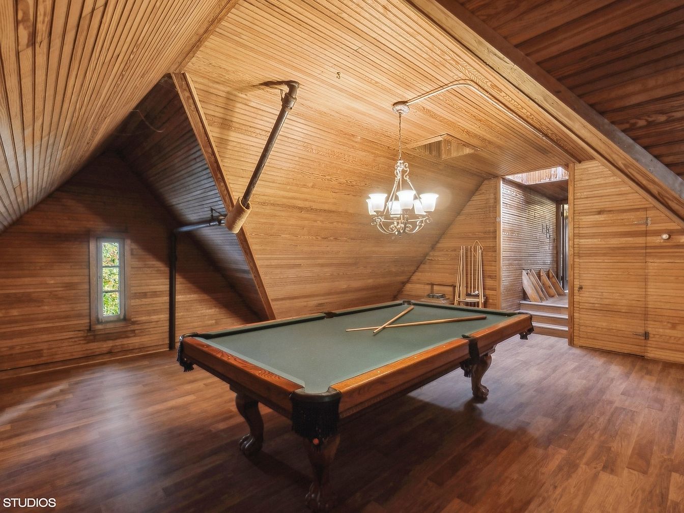 This inviting game room features warm wooden accents that create a cozy atmosphere, with walls and ceilings adorned in rich paneling. A classic billiards table occupies the center, perfect for family gatherings and friendly competitions. Natural light pours through a quaint window, enhancing the space’s warmth along with the gentle glow from a stylish chandelier. The layout promotes engagement, while the smooth hardwood floor contributes to a welcoming feel. Additional storage areas by the entrance ensure that cues and accessories are neatly organized, making this room an ideal retreat for leisure and bonding, evoking the charm of a rustic lodge.