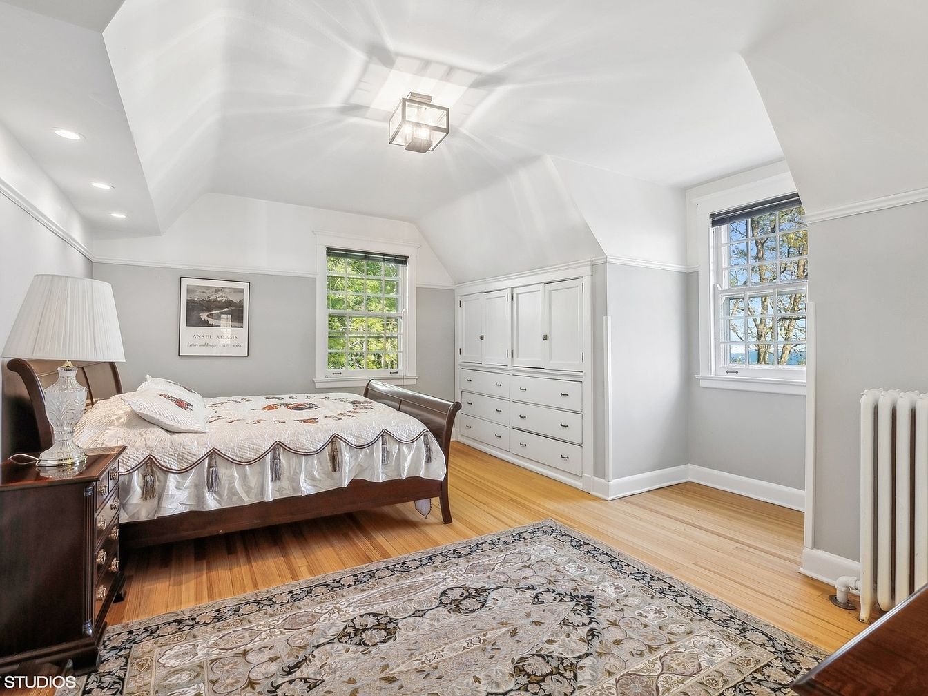 This inviting master bedroom features a charming blend of traditional and modern design elements. The spacious layout is highlighted by lofty ceilings and a muted gray color scheme that enhances the natural light flowing through the windows. A luxurious sleigh bed, adorned with a quilt and decorative pillows, creates a cozy focal point, while a sleek nightstand complements the elegant decor. White built-in cabinetry provides ample storage while maintaining a clean aesthetic. The warm hardwood floors are topped with an intricately patterned area rug, adding comfort and warmth to the space. Ideal for relaxation, this room epitomizes family-friendly living.