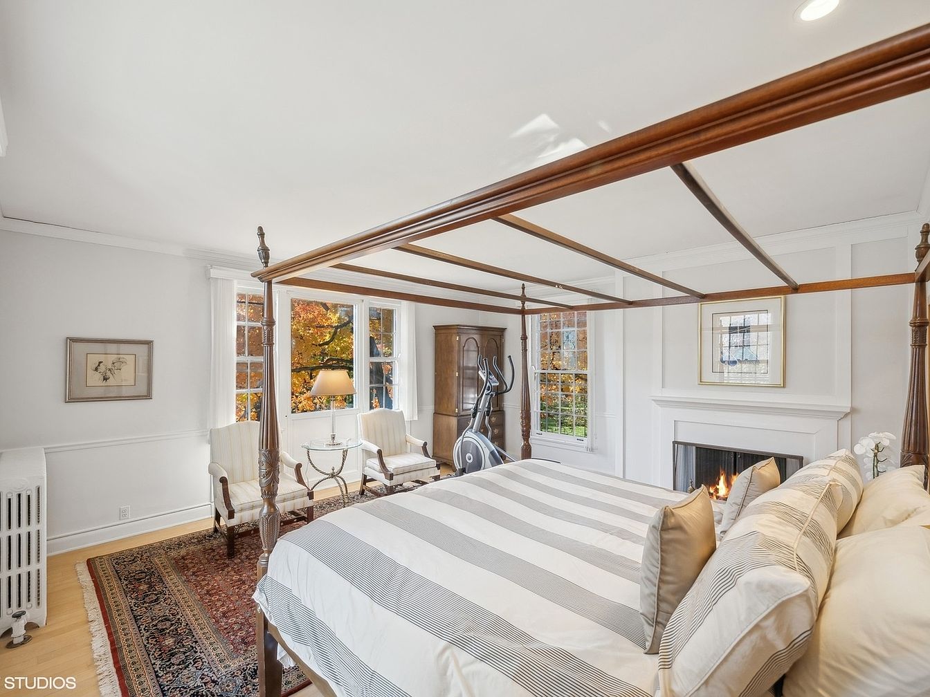 This master bedroom exudes elegance with its four-poster canopy bed, adorned in soft, striped linens that create a cozy yet sophisticated atmosphere. Calming neutral tones enhance the inviting ambiance, complemented by rich wood accents and a plush area rug that ties the space together. Natural light floods the room through large windows, showcasing views of vibrant autumn foliage outside. Two stylish armchairs provide a tranquil nook for relaxation, while the decorative fireplace adds warmth and charm. Architectural details, like crown molding and wainscoting, reflect classic design, making this bedroom a perfect family-friendly retreat.