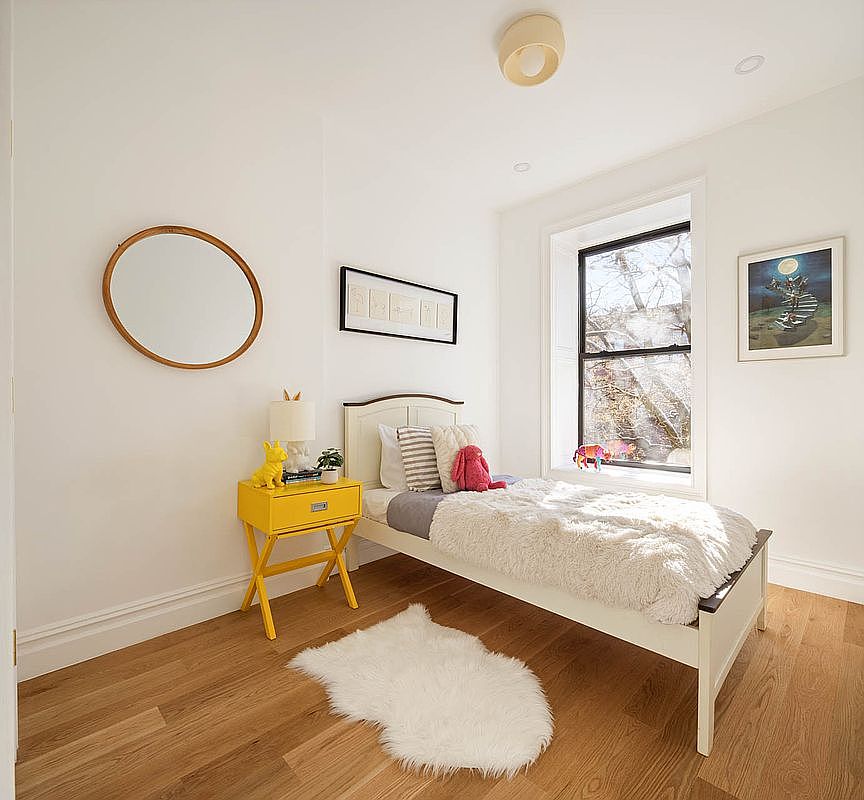 This cozy kid’s bedroom features a bright and inviting atmosphere, complemented by a playful color scheme. A comfortable bed with a soft, fluffy blanket invites relaxation, while vibrant striped pillows add a pop of fun. A sleek yellow nightstand stands out against the crisp white walls, balancing functionality and cheerful aesthetics, while a whimsical plush toy enhances the playful vibe. Natural light floods in through the large window, illuminating the warm wooden floor and a soft white rug that offers a cozy touch underfoot. The wall decor blends art and simplicity, creating an inspiring and welcoming space for children.