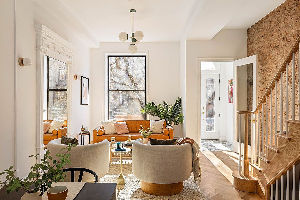 This inviting living room features a bright, open layout that seamlessly combines modern comfort with elegant design. Rich textured elements, like the exposed brick wall and stylish staircase, create warmth and character. A sleek, amber leather sofa serves as a focal point, adorned with plush pillows that invite relaxation. Complementing the seating are cozy, rounded chairs that enhance the family-friendly vibe. The space is illuminated by a contemporary pendant light and large windows, bringing natural light and a sense of airiness. Earthy tones and greenery, including a vibrant potted plant, enhance the inviting atmosphere and foster a serene ambiance.