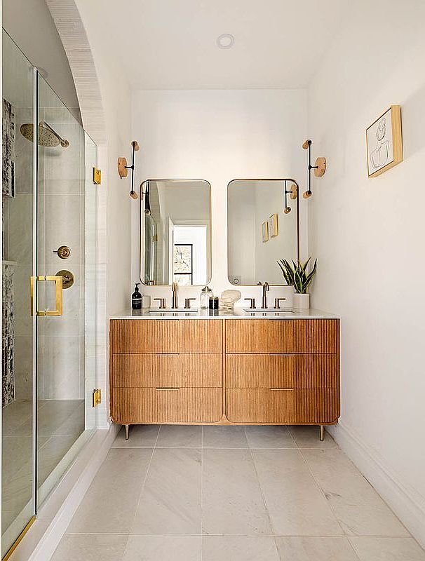 This stylish bathroom features a double vanity with a beautifully textured wooden cabinet, offering ample storage with its spacious drawers. The minimalist marble countertop complements the warm tones of the wood, while sleek gold fixtures add a touch of luxury. Two large mirrors above the sinks enhance the sense of space and light. Natural light pours in through a nearby window, illuminating the soft white walls and large-format tile flooring, which exudes a clean and polished look. A glass shower enclosure showcases marble detailing, bringing elegance to everyday routines in this inviting family-friendly space.