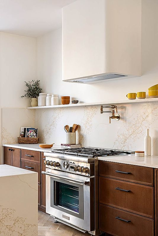 This kitchen features a harmonious blend of contemporary and rustic elements, characterized by sleek wooden cabinetry that provides warmth against the light, marble-inspired backsplash. The stainless steel range serves as a focal point, complemented by a stylish hood that enhances its modern appeal. Open shelving displays carefully curated dishware, adding a personal touch while keeping essentials within reach. The space is enhanced by warm yellow and earthy tones in the decor, creating an inviting atmosphere perfect for family gatherings. Thoughtful design and layout maximize functionality, ensuring that this kitchen is both practical and aesthetically pleasing.