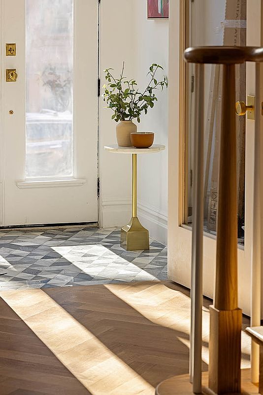 This welcoming entryway features a harmonious blend of modern aesthetics and functional design. The geometric patterned floor tiles transition beautifully into a warm wooden herringbone that adds depth. A chic brass side table stands elegantly beside the front door, holding a simple potted plant that livens up the space. Natural light pours in through the large glass door, enhancing the crisp white walls and creating an inviting atmosphere. Architectural details, such as the sleek line of the door frame and subtle decor choices, contribute to a family-friendly environment that is both stylish and practical.