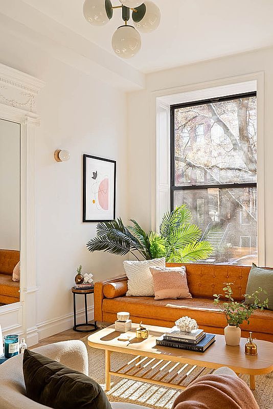 This inviting living room features a harmonious blend of modern and vintage design elements. A rich, tan leather couch, adorned with soft, pastel pillows, serves as the focal point against crisp white walls that radiate light. Large windows allow natural light to flood the space, accentuating the elegant crown molding and enhancing the airy ambience. A cozy area rug anchors the room, offering a soft underfoot feel. Complementary furniture, including a stylish coffee table, showcases decorative items, while vibrant greenery adds a refreshing touch. This space is perfect for family gatherings, encouraging relaxation and connection.
