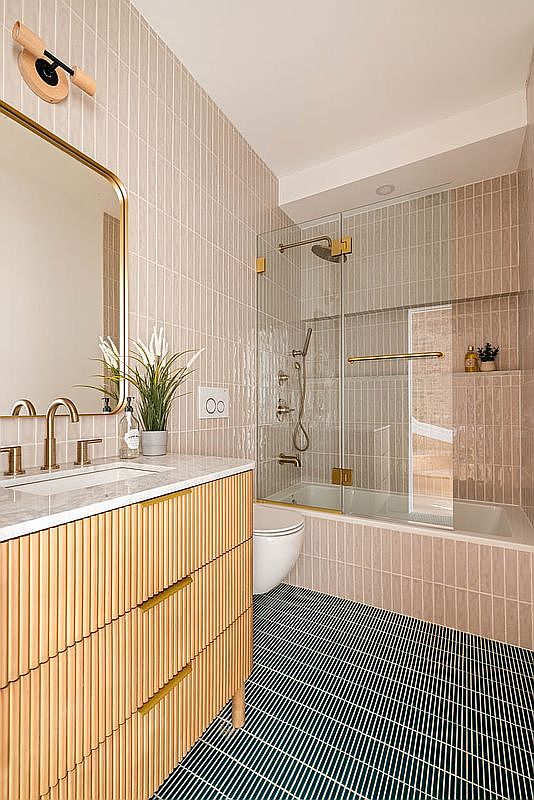 This modern bathroom features an elegant blend of style and functionality. Highlighting a textured, soft pink tile backdrop, the space is complemented by a luxurious marble countertop on a chic striped vanity, which provides ample storage. The combination of brass fixtures adds warmth to the bright environment, while the sleek glass shower enclosure enhances visual openness. A deep soaking tub promises relaxation, with strategically placed plants bringing a touch of nature inside. The patterned green tile floor contrasts beautifully, creating an inviting atmosphere. Ideal for families, this bathroom combines aesthetics with practical features for everyday use.