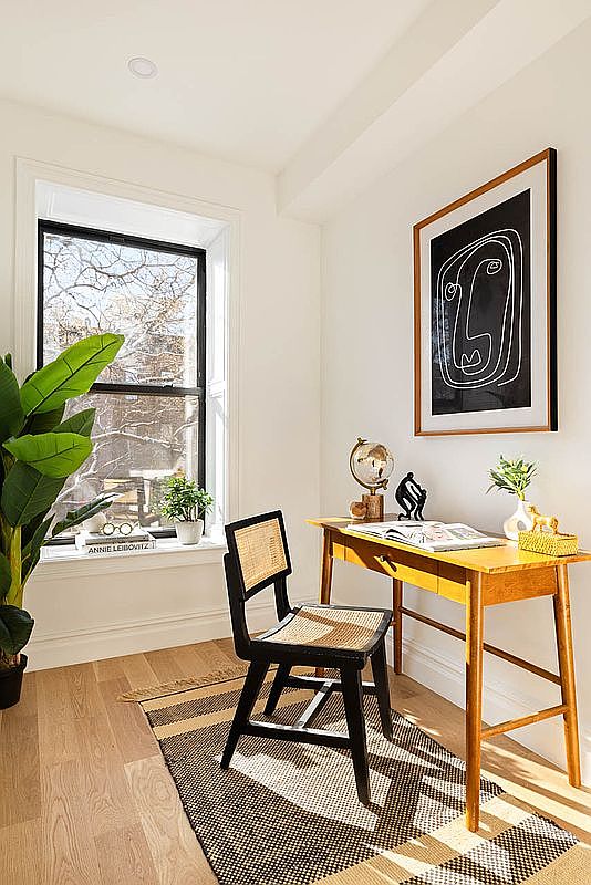This inviting home office features a bright and airy layout, with natural light streaming through a large window. The light wood flooring complements the soft, neutral color scheme of the walls, creating a calming atmosphere. A stylish wooden desk, paired with a sleek black chair, provides a perfect workspace, while decorative touches like a small globe and vibrant plants add character. Above the desk, an eye-catching piece of modern artwork contrasts beautifully with the minimalist design. The room’s thoughtful arrangement encourages productivity, making it an ideal space for work or creative pursuits in a family-friendly environment.
