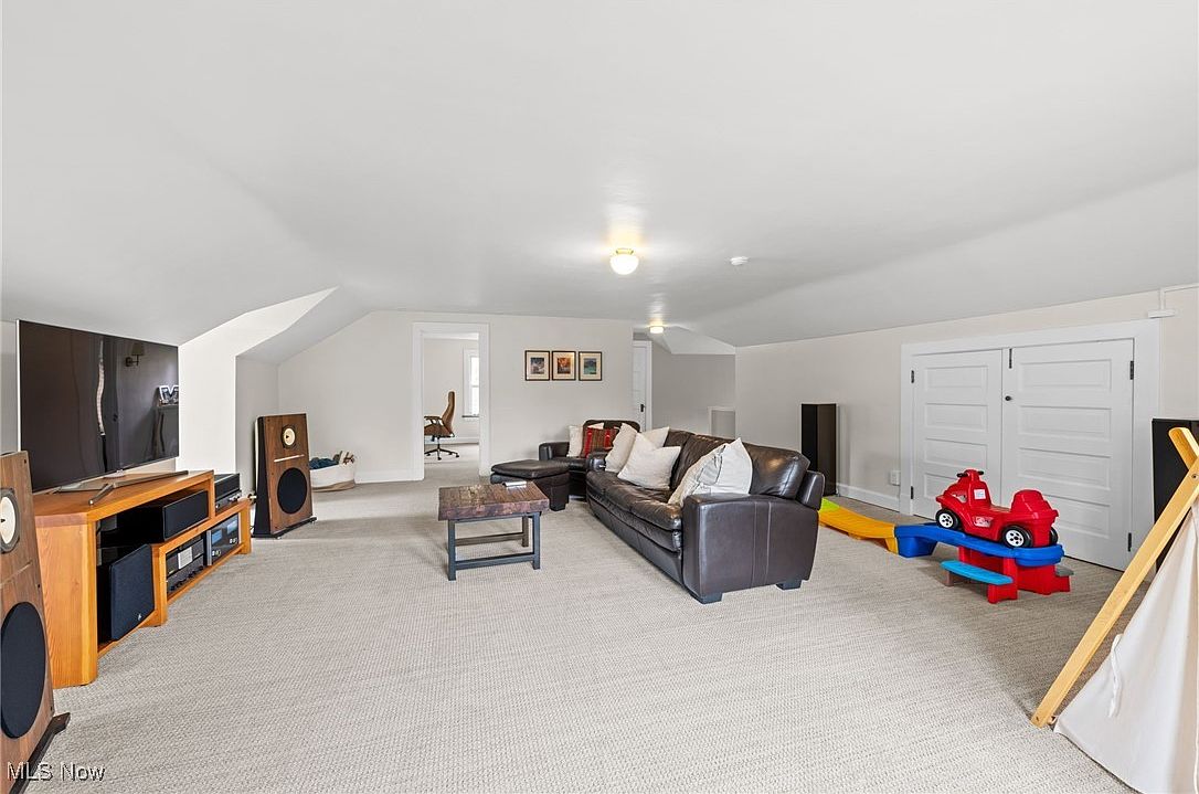 A spacious, multi-functional bonus room is designed for family relaxation and play. The soft gray carpeting and clean, white walls create a soothing, modern backdrop. A large, comfortable brown leather sectional anchors the seating area beside a rustic coffee table, facing a big-screen TV with quality stereo speakers for immersive entertainment. Pops of color come from a tidy kid’s play corner, complete with a small slide and ride-on car, making the space perfect for children. Sloped ceilings and dormer-style alcoves add charm, while framed art and natural light enhance the warm, inviting atmosphere ideal for family gatherings.