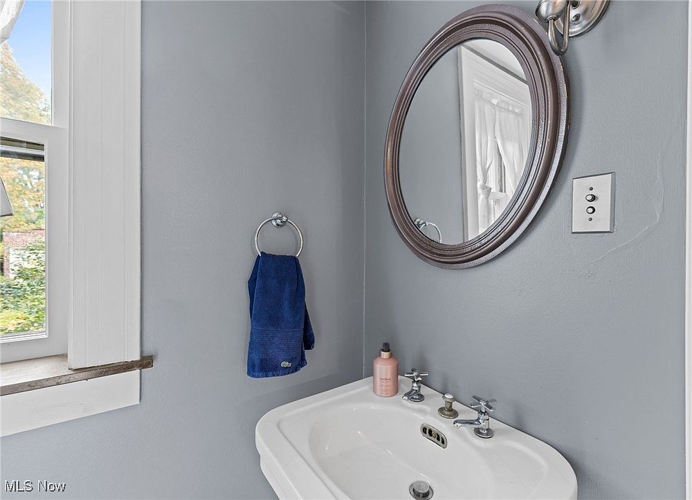 A charming bathroom sink area that balances practicality and style. Soft gray walls create a calming atmosphere, complemented by crisp white trim around the window, which allows ample natural light to brighten the space. A round mirror framed in bronze adds a touch of elegance above the classic porcelain pedestal sink. Modern, silver fixtures and a blue hand towel lend a pop of color while keeping the space functional for a family. Minimalist accessories, such as soap and lotion dispensers, offer convenience, making this a welcoming and tidy spot that is both family-friendly and aesthetically pleasing.