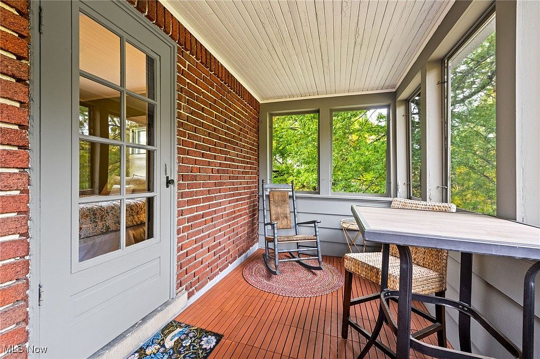 A warm and inviting screened porch offers a relaxed retreat with its classic blend of rustic brick and soothing gray woodwork. Ample windows frame leafy green views, drawing in soft, natural light and creating a peaceful atmosphere ideal for morning coffee or unwinding in the evening. The space features a charming rocking chair on a textured area rug and a bar-height table with woven seats, providing flexible seating options for family gatherings or quiet moments. Durable flooring and the simple, muted palette bring timeless charm and make this spot perfect for casual family living or entertaining guests.