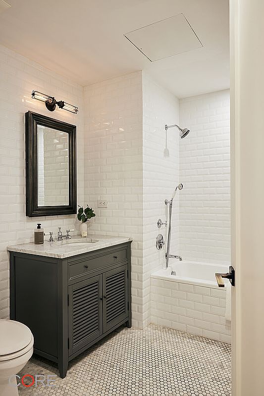 This elegant bathroom features a sleek design that blends modern aesthetics with functionality. The wall-to-wall white subway tiles create an airy and spacious feel, complemented by a chic black-framed mirror that adds sophistication. A stylish dark cabinet houses the marble countertop, providing ample storage while maintaining a clean look. The hexagon tile flooring offers a touch of vintage charm, enhancing the family-friendly atmosphere. With a convenient bathtub and a well-placed shower, this space caters to relaxation and practicality. Soft lighting fixtures illuminate the room, creating a warm, inviting environment perfect for unwinding at the end of the day.
