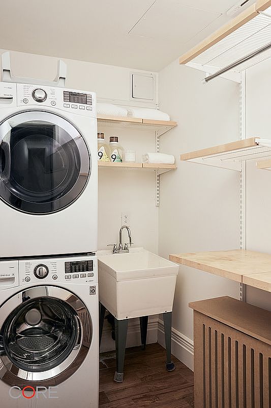 This thoughtfully designed laundry room effortlessly balances functionality with modern aesthetics. Featuring a sleek pair of front-loading washers and dryers, the space maximizes efficiency while maintaining a tidy appearance. Light-toned wooden shelves provide ample storage for detergents and essentials, while a dedicated utility sink offers convenience for handwashing delicate items. The neutral color palette, paired with warm wooden accents, creates an inviting atmosphere. Practical details, like easy-to-clean flooring and a minimalist drying rack, cater to family needs, making laundry chores more enjoyable. This space is a perfect blend of modern design and everyday practicality, ideal for busy households.