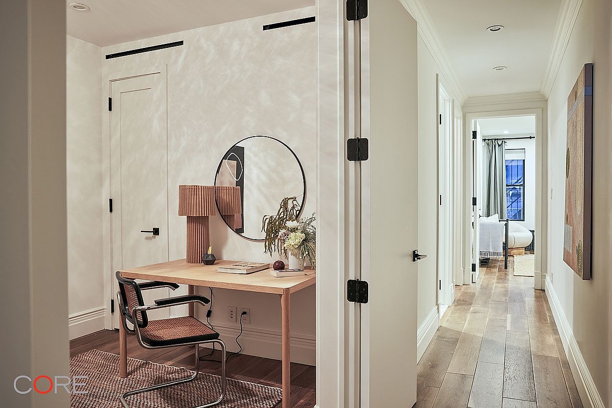 This cozy home office nook combines functionality with style, featuring a light wood desk paired with a sleek, modern chair. A unique, textured lamp stands on the desk, illuminating the circular mirror that adds depth to the space. The textured wallpaper and muted color palette evoke warmth, while hardwood flooring enhances the natural feel. Family-friendly features include ample natural light streaming through the window at the end of the hallway, creating an inviting atmosphere. The subtle decor elements, such as a vase of fresh flowers and decorative accents, emphasize a thoughtful approach to home design, making the workspace both stylish and welcoming.