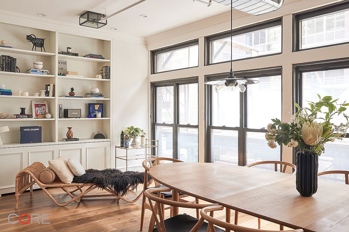 This inviting dining area features a spacious wooden table surrounded by elegant bentwood chairs, perfect for family gatherings. The large, industrial-style windows flood the space with natural light, enhancing the warm wooden tones of the floors and furnishings. A stylish lounge chair, draped with a cozy throw, complements the room’s relaxed vibe. Shelves adorned with books and decorative accents provide personal touches, while a chic floor lamp adds modern flair. A stunning floral arrangement in a sleek vase brings life and color to the table, making this area a perfect blend of comfort and functionality.