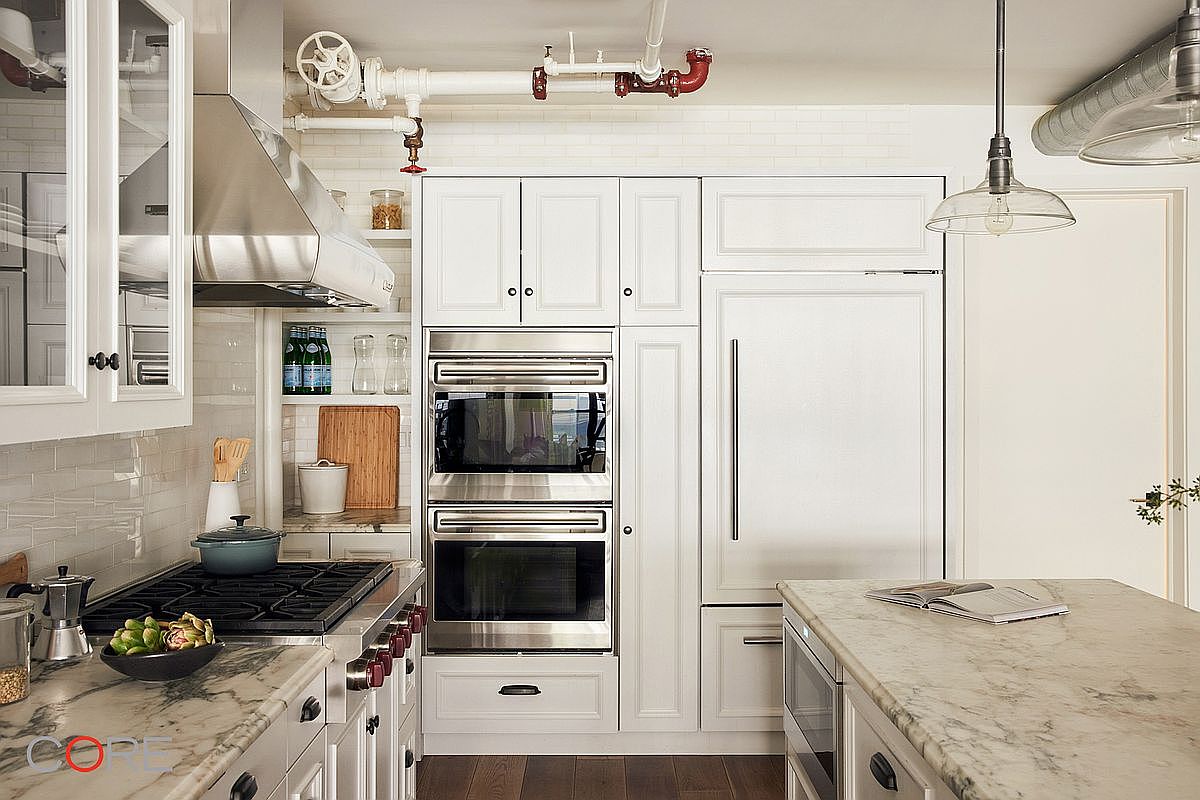 This modern kitchen seamlessly blends functionality with aesthetic appeal. Sleek white cabinetry contrasts beautifully with premium marble countertops, offering ample workspace for culinary creativity. Stainless steel appliances, including double ovens and a gas range, provide high efficiency, while the stylish extractor hood adds a touch of elegance. The open shelving displays glassware and essentials, enhancing the kitchen’s inviting atmosphere. Rich wooden flooring warms the space, alongside industrial elements like exposed piping and pendant lighting, which contribute to its contemporary charm. Family-friendly features such as easy-to-clean surfaces and an efficient layout make this kitchen perfect for gatherings and daily use.