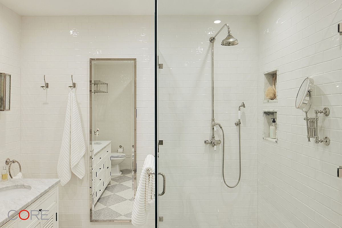 This elegant bathroom showcases a seamless blend of functionality and style. The spacious layout features dual sinks set in a polished marble countertop, complemented by a stylish vintage mirror encased in a weathered frame. White subway tiles create a fresh, clean aesthetic while providing a timeless backdrop. Thoughtfully designed, the glass shower enclosure offers easy access, emphasizing modern convenience. Stylish vanity lighting adds warmth, enhancing the overall ambiance. Family-friendly features include ample storage options and towel hooks for easy organization. Delicate floral arrangements introduce a touch of nature, creating a serene and inviting environment for daily rejuvenation.