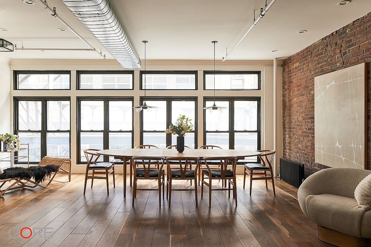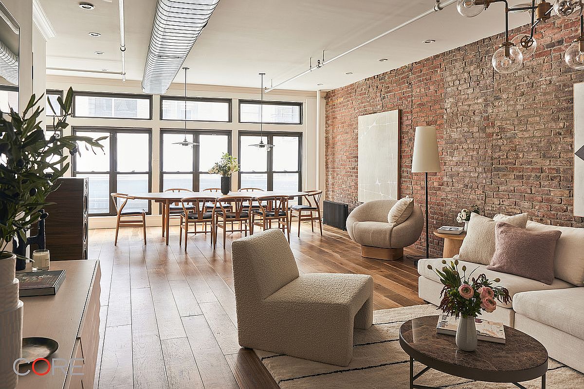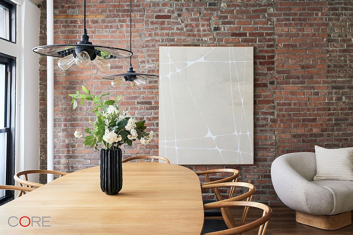 This spacious open living area seamlessly blends modern comfort with industrial charm. The room features exposed brick walls that add character, contrasted by sleek wooden flooring that enhances warmth. A stylish white sofa and a unique, sculptural chair provide inviting seating, while a coffee table adorned with fresh flowers adds a touch of elegance. The dining area, dominated by a long wooden table surrounded by classic chair designs, is bathed in natural light from large windows, making it ideal for family gatherings. Complemented by striking pendant lighting and minimal decor, this space is perfect for relaxation and entertaining.