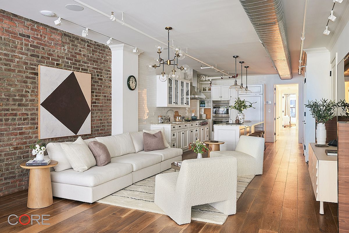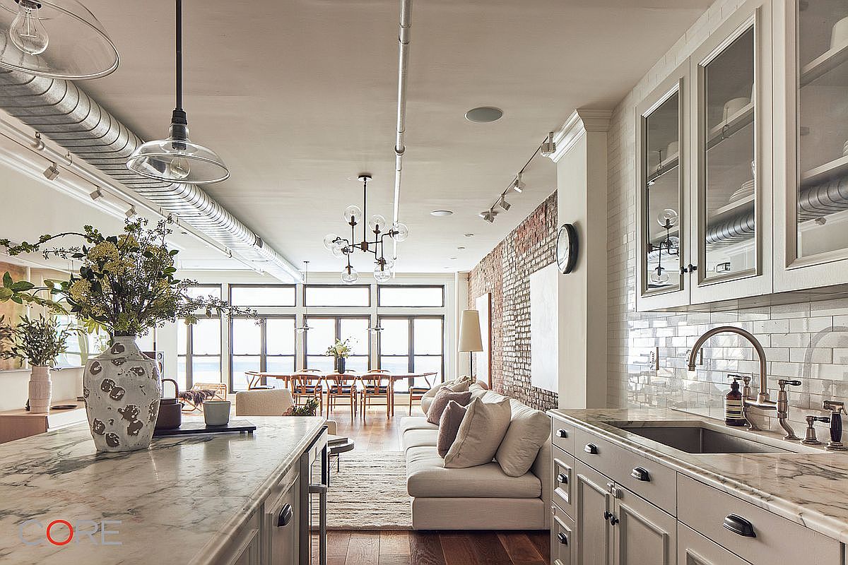 The open-concept living area seamlessly combines kitchen and lounge, creating a warm, inviting atmosphere ideal for family gatherings. The design features exposed brick walls contrasted by sleek, white cabinetry, while a large marble countertop invites casual dining. Natural light floods through expansive windows, enhancing the neutral color palette of soft beige and rich wood tones. Elegant lighting fixtures, including a vintage-style chandelier, add character, complementing the cozy sectional adorned with plush cushions. Thoughtfully arranged greenery intersperses throughout, offering a fresh touch, making this space perfect for relaxation and social interaction.