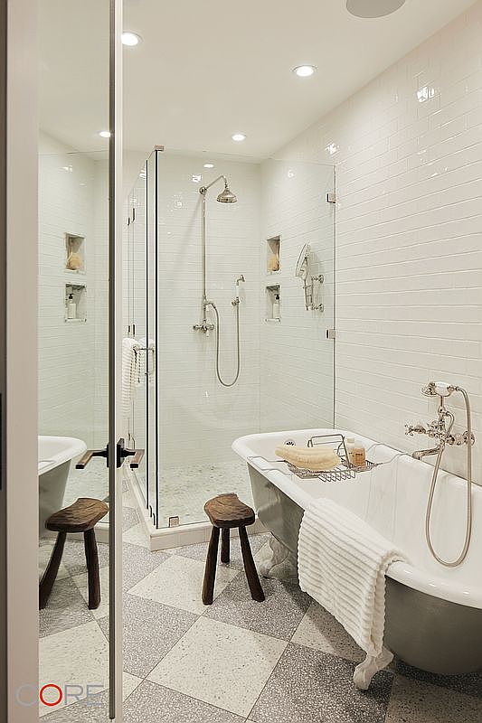 This modern bathroom features a sophisticated layout with a spacious glass shower and a classic freestanding tub, designed for relaxation. Clean white subway tiles enhance the room’s brightness while the textured flooring adds visual interest. Two rustic stools provide convenient seating and add warmth to the aesthetic. The chrome fixtures and minimalist decor echo contemporary style, balancing functionality with elegance. Thoughtfully integrated niches display bath essentials, maintaining a clutter-free environment. The overall ambiance promotes a serene escape, making it a perfect family-friendly space for both pampering and daily routines, ensuring everyone can enjoy a touch of luxury.