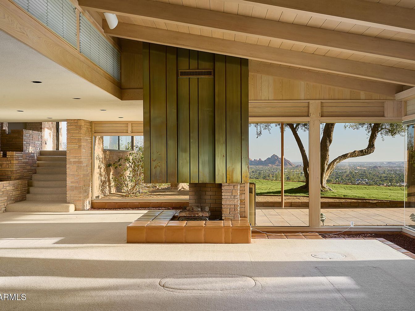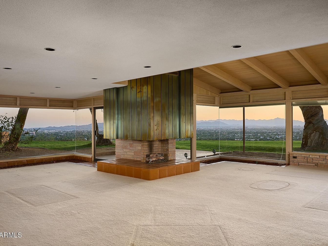 This spacious living room exudes a blend of modern elegance and natural beauty, framed by panoramic windows that offer spectacular views of the surrounding landscape. The centerpiece is a striking, metallic-clad fireplace that adds a contemporary touch while providing a warm focal point. Rich wooden beams span the ceiling, enhancing the room’s height and airy feel. Soft, neutral carpeting complements the light color scheme, creating a cozy atmosphere perfect for family gatherings. Thoughtfully designed with ample space, the layout encourages movement and social interaction, making it an inviting retreat for both relaxation and entertainment.